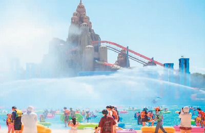为提升游园舒适度,园内设置了充足的遮阳设施、雾森系统,遮阳面积占全园硬质铺装面积的1/3;除常规淋浴区外,还配有家庭淋浴区,满足亲子家庭出游需求。为了让游客玩得更安心,水公园配备了国际先进的水处理设备,1.3万立方米的水体每隔0.5至2.5小时会循环消毒净化一次。同时,专业的水上救护团队遍布园区各处,为游客的安全保驾护航。