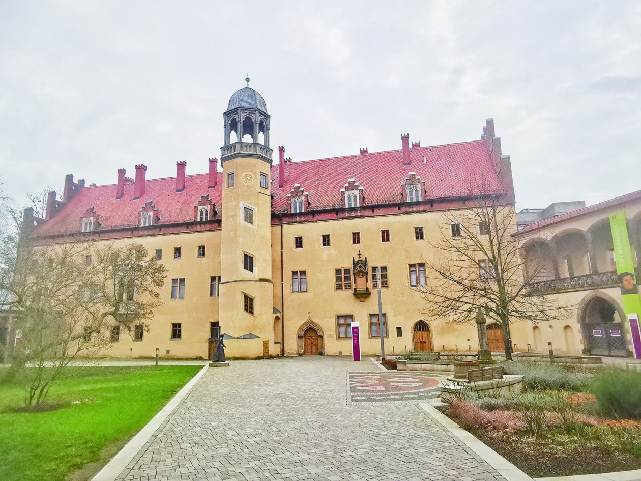 顺着“鱼脊”一路东行。鳞次栉比的楼房大体保留着二三百年前的面貌。跳入眼帘的美式牛排馆、南亚餐厅、寿司店不断提示我置身于全球化的21世纪,可一个个楼门旁焊牢的纪念铭牌又让我一次次闪回过去。从“德国之师”梅兰希通到莱辛、歌德、席勒、海涅,从丢勒到老克拉纳赫,他们在这里驻留的身影足以让文艺爱好者们频频蓦然回首。城虽小,大学扬名。对理科生来说,哈雷-维滕堡大学是物理学圣地,威廉·爱德华·韦伯、古斯塔夫·赫兹……