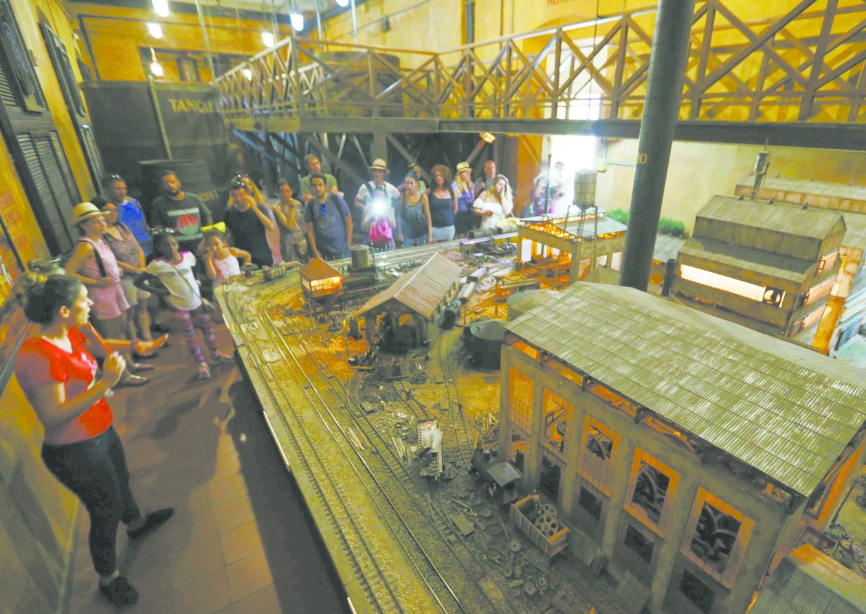 博物馆位于一座橘黄色的西班牙殖民风格庭院内。上楼走进展厅,巨大的壁画映入眼帘,上面描绘了古巴甘蔗田漫山遍野的情景,向前走,能看到朗姆酒蒸馏厂的微观模型——冒着烟的蒸汽小火车拉着一车车甘蔗驶向制酒厂的大车间。博物馆讲解员向记者介绍,模型展示的是20世纪30年代的朗姆酒蒸馏厂。1934年,西班牙企业家何塞·阿雷卡瓦拉创建了哈瓦那俱乐部朗姆酒品牌,当时品牌的蒸馏厂就位于哈瓦那。