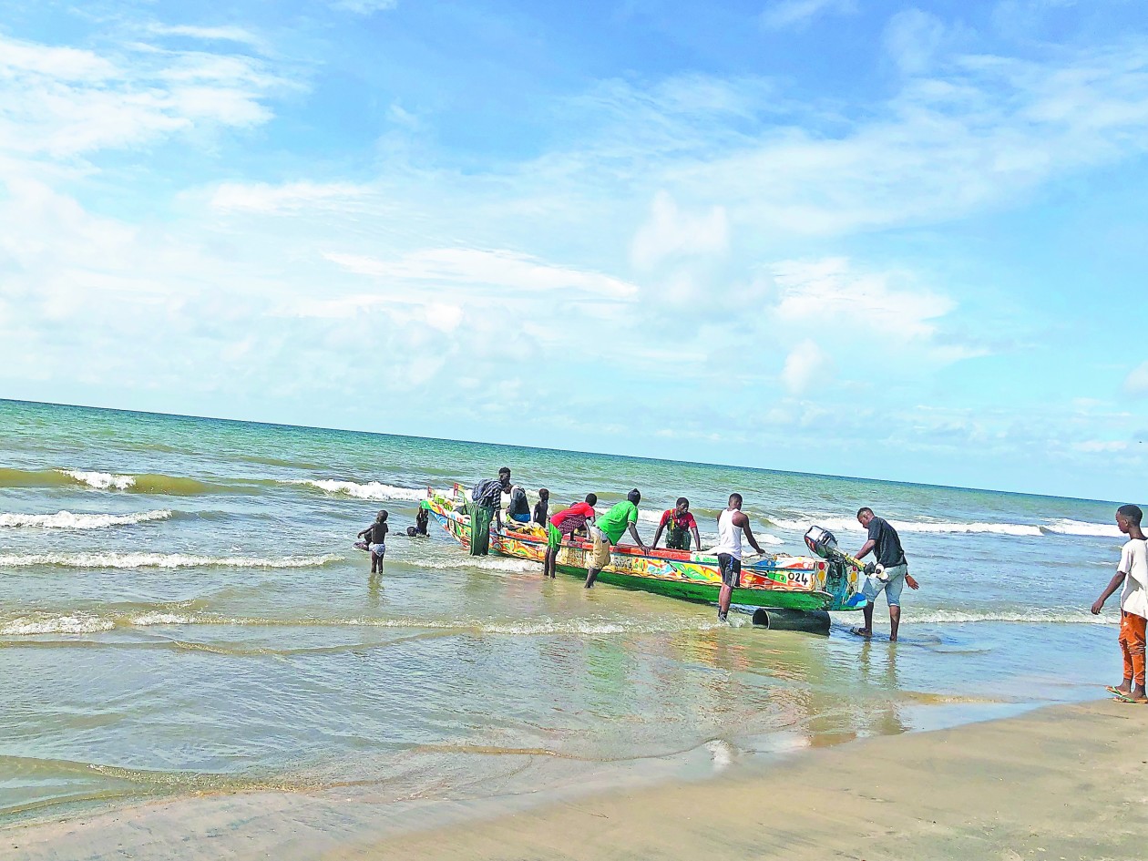 记者登上冈比亚河的一条船,试着撒网,但“颗粒无收”。同船的小伙子钓上来一条35公斤重的鱼,开心得一天合不拢嘴。
