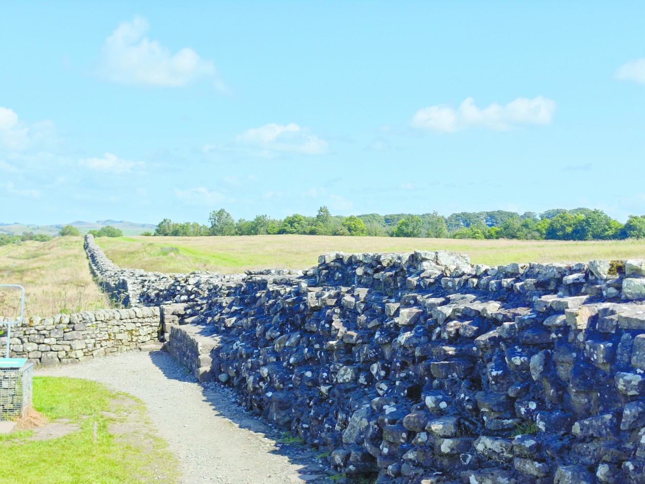 沿着英国B6318号公路向西行驶,大部分时候,哈德良长城的遗迹就在公路左侧,伴随着高低起伏的山丘,时而与路边的田野相融,时而隐匿于山丘的转角。城墙旁,紫色的洋地黄在阳光下摇曳,给这一片古老的遗迹增添一抹神秘的色彩。