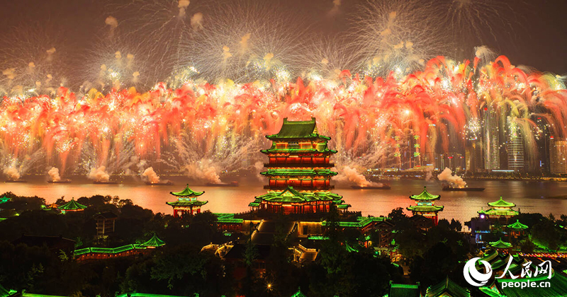 夜幕降临,赣江之心老官洲与303双子塔灯火璀璨,成为全城焦点。“盛世华彩 豫章欢歌”国庆烟花晚会如期上演。双子塔顶的特效烟花与江面9艘驳船共同构筑起1300米的“花火长廊”,形成立体绚丽的视觉奇观。
