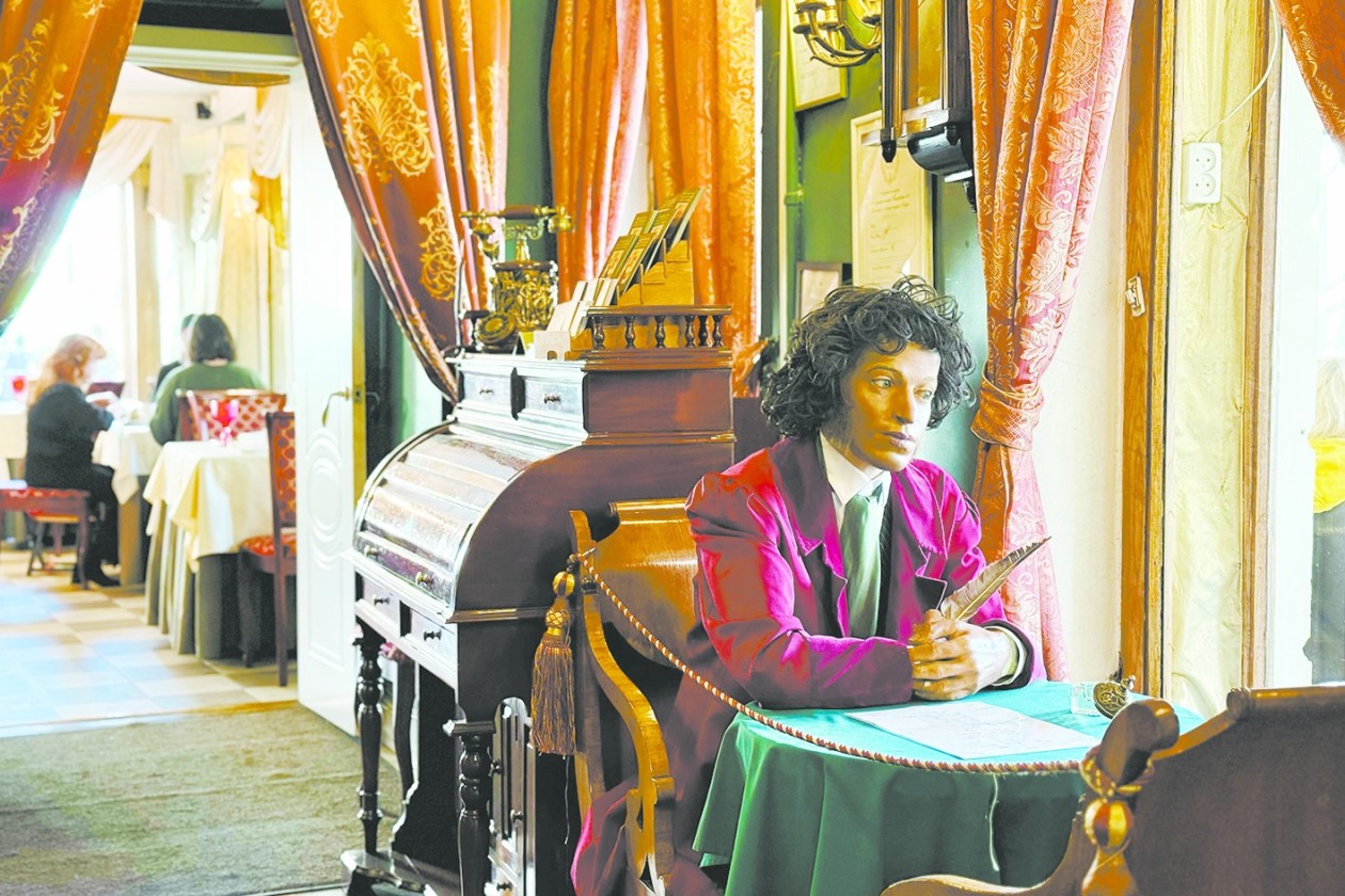 今天的文学咖啡馆,保留了大量19世纪的装饰风格。高高的天花板、复古的吊灯、深色的木质家具,墙上挂着多幅普希金的画像。一楼普希金生前最后坐过的位子被绳子围着,一尊蜡像还原了他当时的模样:凝视着窗外,手执羽毛笔,仿佛正在构思写给至爱的信。