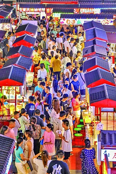 再仔细听,“来一杯冰水降降火”“现切的水果,快来尝一尝喽”,吆喝声、欢笑声、吉他声交织在一起,从街这头一直传到街那头……