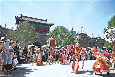 “面前舞台上演绎着古老的历史故事,身后是错落有致的仿古建筑、古色古香的街道,在这样的环境里看演出,真有一种‘入戏’的感觉。”来自上海的游客潘楚湘说。