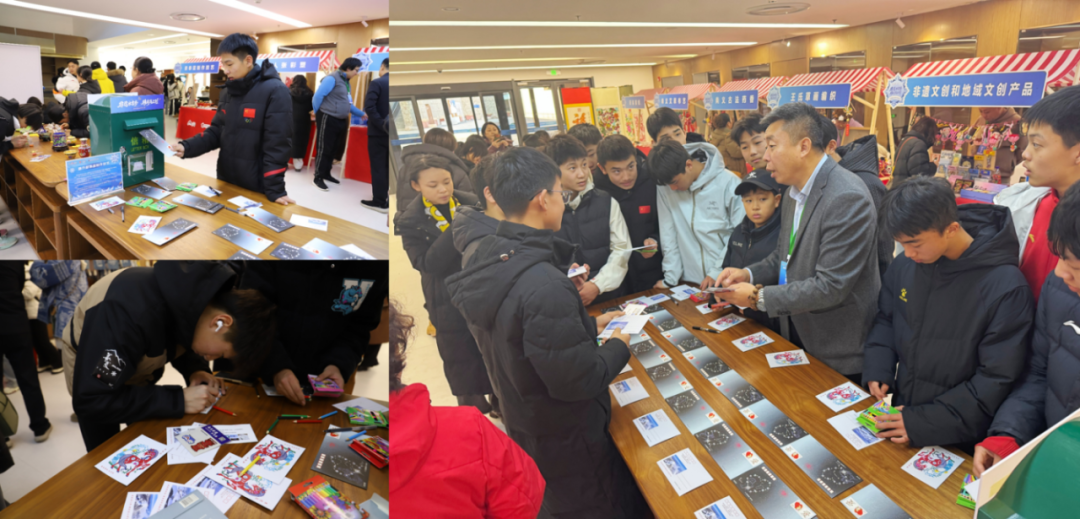 活动启幕现场,非遗体验区热闹非凡。蔚县剪纸展位前,传承人手持剪刀,在红纸上灵动游走,纸屑纷飞间图案渐显;景泰蓝点蓝体验区一位游客屏息凝神,小心调整手中力道——“原来填色如此讲究,轻则留空,重则溢釉……”她轻声感慨,指间流淌的是百年工艺的细腻与均衡。一笔一画绘美好,一纸一信载希望,唐氏邮票画的“新年限定非遗DIY”作品-交替封、明信片,成为热门打卡项目。大家不仅把“雪飞燕”和“雪游龙”绘成自己喜爱的色彩,还将对来年的期许、对友人的暖意纷纷投进邮筒,寄给远方惦念的人。