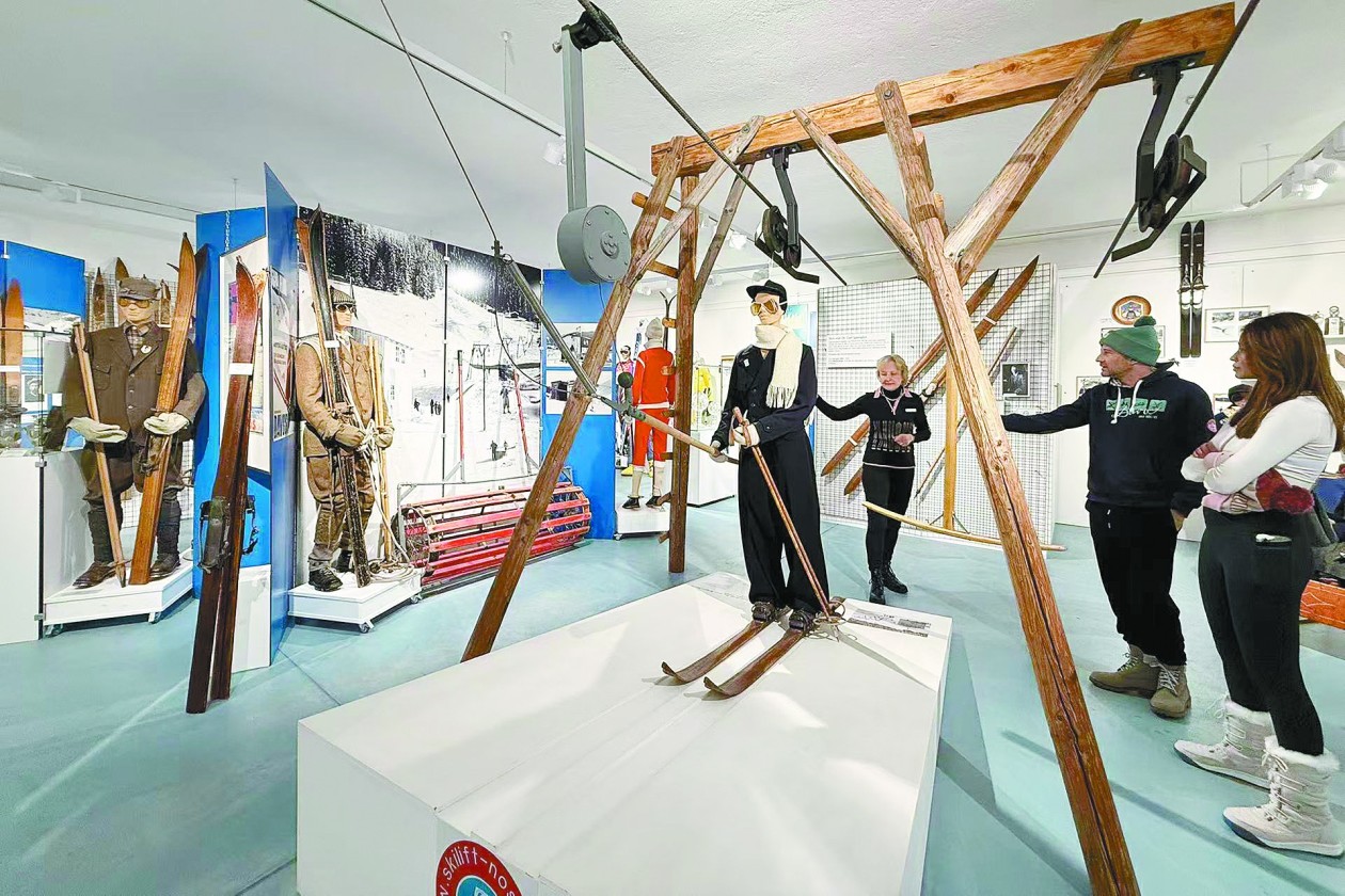 进入第一间展厅,首先看到一个滑雪缆车的还原场景。1934年,世界上第一条用J型木杆拖牵的滑雪缆车在达沃斯的博尔根广场投入运营,这在当时引起了轰动。如果没有拖牵缆车,你只能“爬山2小时”。两年后,J型杆改成T型杆,可以同时拖牵两名滑雪者。如今,达沃斯的这套系统仍在使用中。