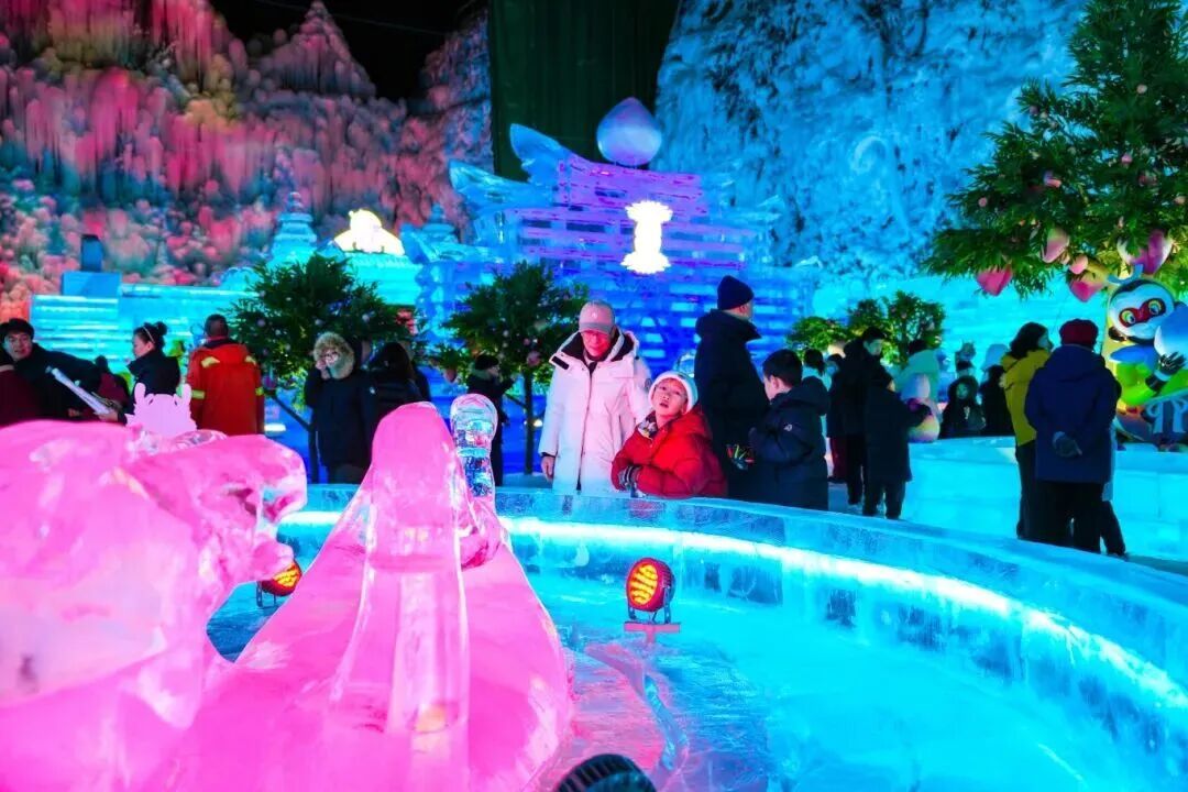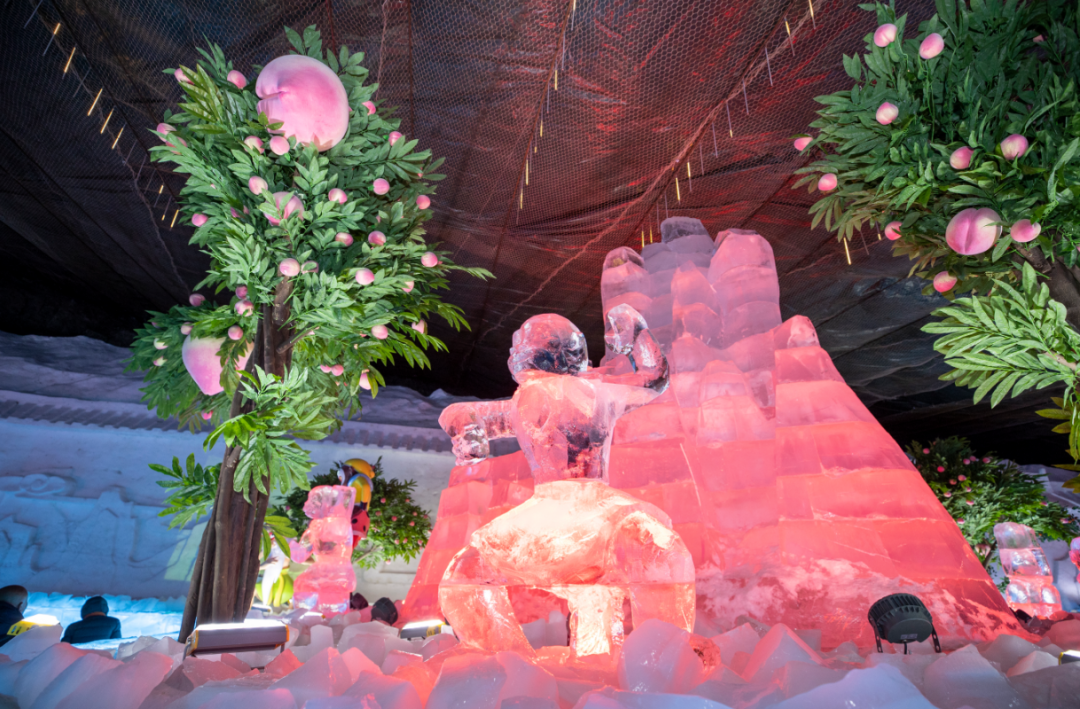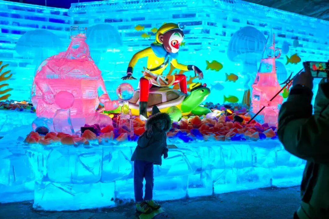 冰灯展区则将《大闹天宫》的奇幻世界搬进冰雪峡谷,“灵猴现世”“龙宫借宝”“大闹天宫”“马上封侯”四大展区串联起完整故事线,20余组大型主题冰建筑与150余件精美冰雕作品,精准还原了动画中的奇幻场景。