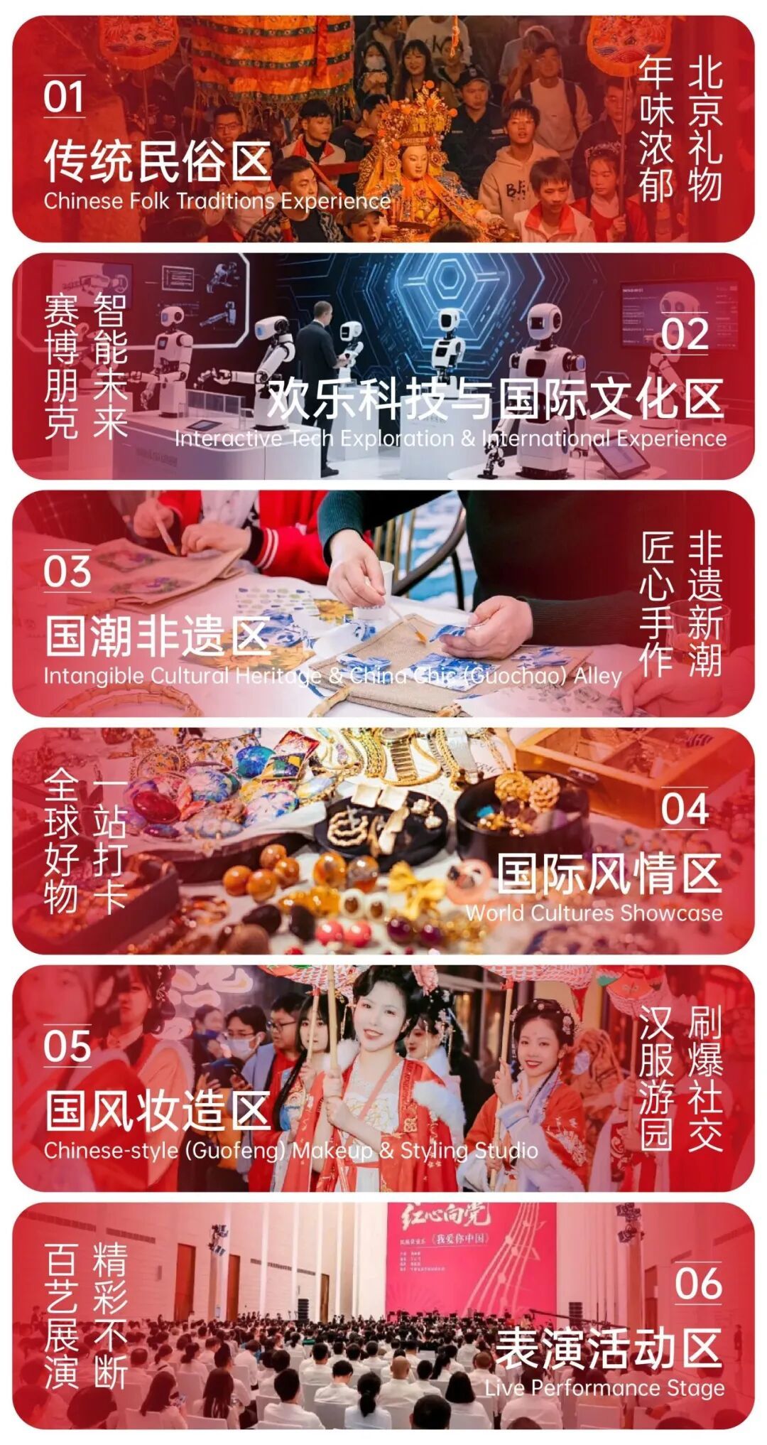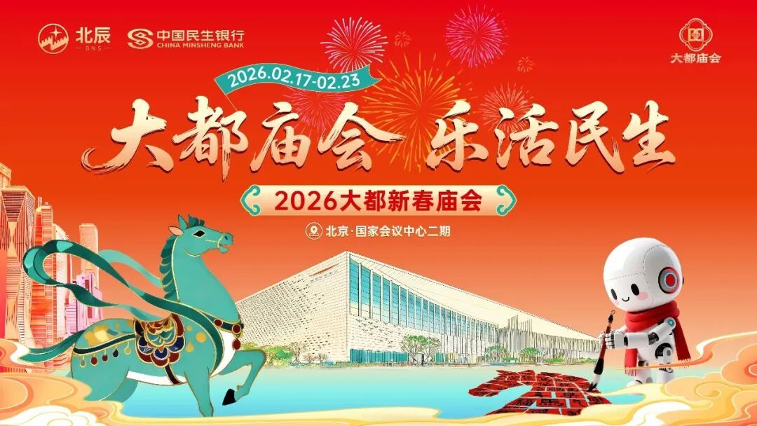 2026大都新春庙会以“国家会客厅,百姓喜乐荟”为定位,聚焦“科技感、国际范、中国味”三大特色,整合亚奥区域内外的文商旅体展等多业态资源,计划在超过6万平方米的主展览空间内,精心设置六大展区,倾力打造集多元体验于一体的现代化新春盛宴。