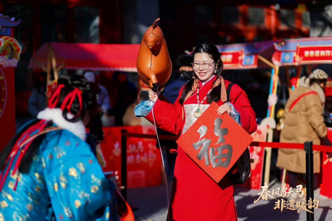 本届厂甸庙会以中华尚马文化为灵感,打造“五花马”主视觉体系。街区内,商户挂出特色招幌,廊桥融入民俗与马年元素,街景灯彩交织砖瓦古韵与年味,再现“酒旗戏鼓厂甸市”的老北京盛景。
