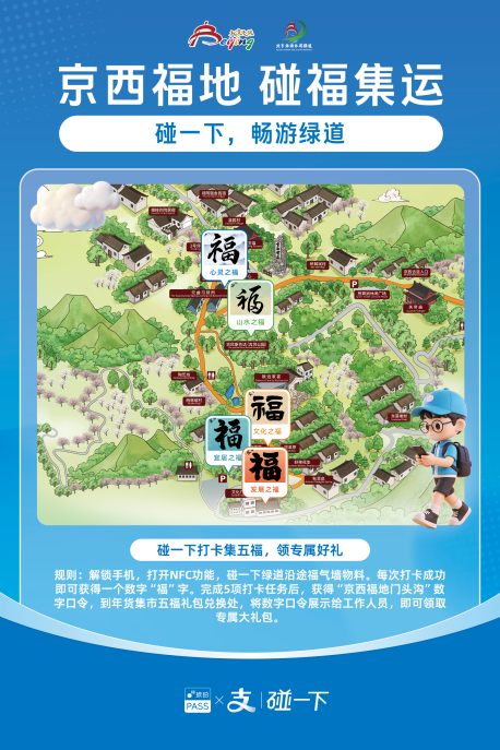 恰逢小年,门头沟区联动支付宝将绿道推介与年俗文化深度绑定,创新推出“京西福地·碰福集运”主题活动。游客漫步绿道时,只需“碰一下”沿途打卡装置,就能收集“心灵、山水、文化、宜居、发展”五大数字福字,集齐即可兑换专属好礼,让年味与绿意相映成趣,点燃新春消费热潮。