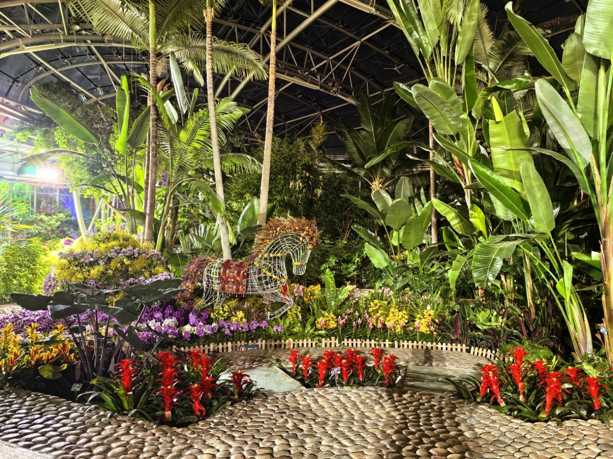 作为2026新春奇妙夜的核心展区,国家植物园(北园)热带展览温室内以兰花为主的近千个品种的万余株花卉,将这里装扮成了花的海洋。四季花园展区内,镂空的骏马在五彩斑斓的灯光下奔驰在花海之中,腾起的阵阵水雾,营造出一种梦幻般的氛围。门区用大量鲜花营造出花墙、花山、花树等景观,让人赏心悦目。幽谷兰境以原生境的形式,集中展示了苦苣苔科、秋海棠科、兰科、蕨类植物、萝藦科、苔藓等植物,展现了兰花的原生境,景区内的月亮、蝴蝶、瓢虫等各色彩灯不时闪亮,更增添了迷幻的色彩。