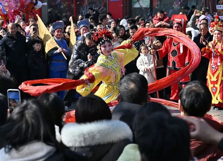 “咚锵、咚锵、咚咚锵……”安徽池州市傩仙镇景区,欢乐年味扑面而来。大年初一,舞者戴上面具、跳起傩舞,穿梭于灯海人潮,给游客拜年送福。在全国各地,越来越多的传统民俗和非遗走出乡野,走进市集,在可感可知的体验中,成为鲜活的年味记忆。