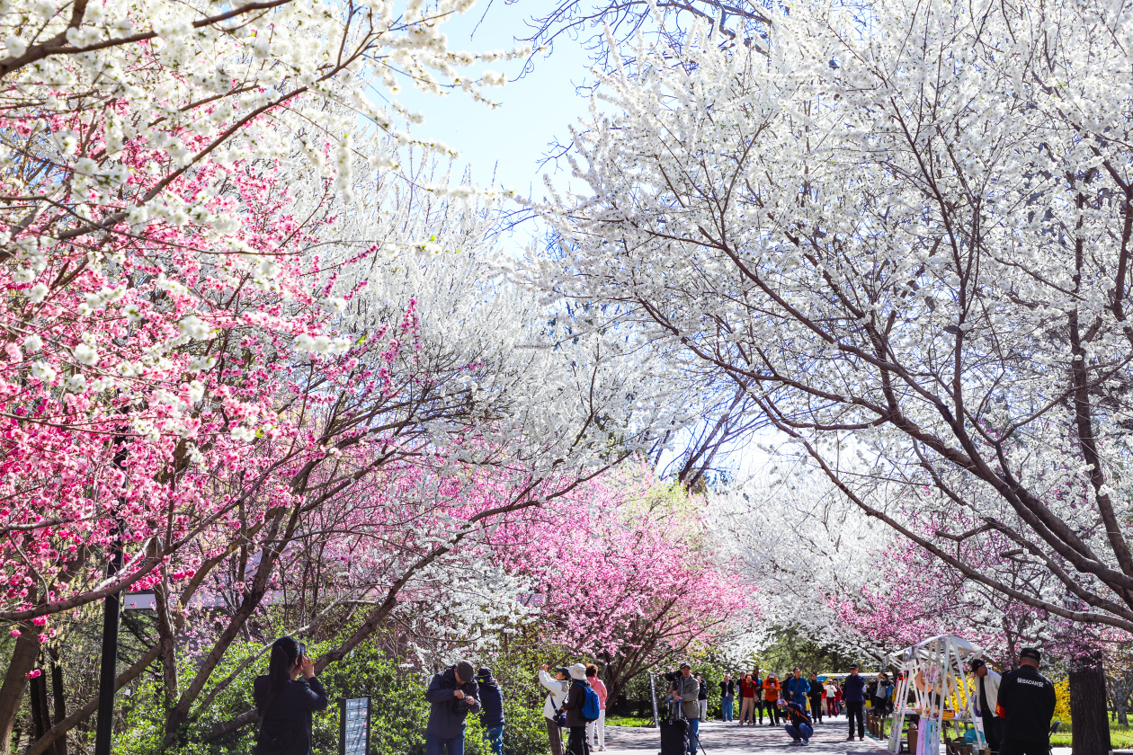 春日赏花景致纷呈,桃花大道繁花缀枝、春意盎然。灿若霞光的‘品虹’桃、‘品霞’桃,与洁白如玉的‘白花山碧桃’交相呼应,为游客呈现出一幅芳菲画卷。‘品虹’桃、‘品霞’桃是国家植物园(北园)拥有自主知识产权的桃花品种,它们弥补了早春时期缺少艳丽桃花的缺憾,完美填补了山桃与碧桃间的花期断档。