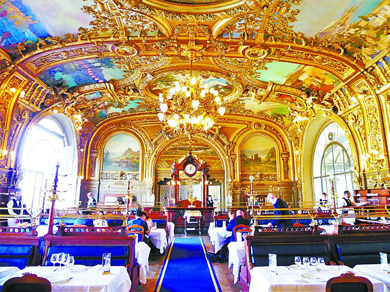 建成至今,“蓝色火车”从未离开里昂站,但每到固定时间,两位身穿蓝色制服、头戴蓝色圆帽的列车礼宾还会走到餐厅中央跟大家报站名,然后再高歌一曲皮雅芙的《玫瑰人生》或阿兹纳夫的《带我走》等上世纪的经典名曲。在礼宾报站时刻,我才发觉,原来以摩纳哥、马赛老港、奥朗日剧场、普罗旺斯玫瑰、勃朗峰、布尔歇湖等等为主题的壁画都是当年“蓝色列车”停靠的旅游目的地。餐厅中央大厅的绘画表现了很多巴黎上世纪初的景致,提示众人巴黎是列车的始发站,而阿尔及利亚等列车从未前往的地方则勾起人们对地中海北非风情的幻想。