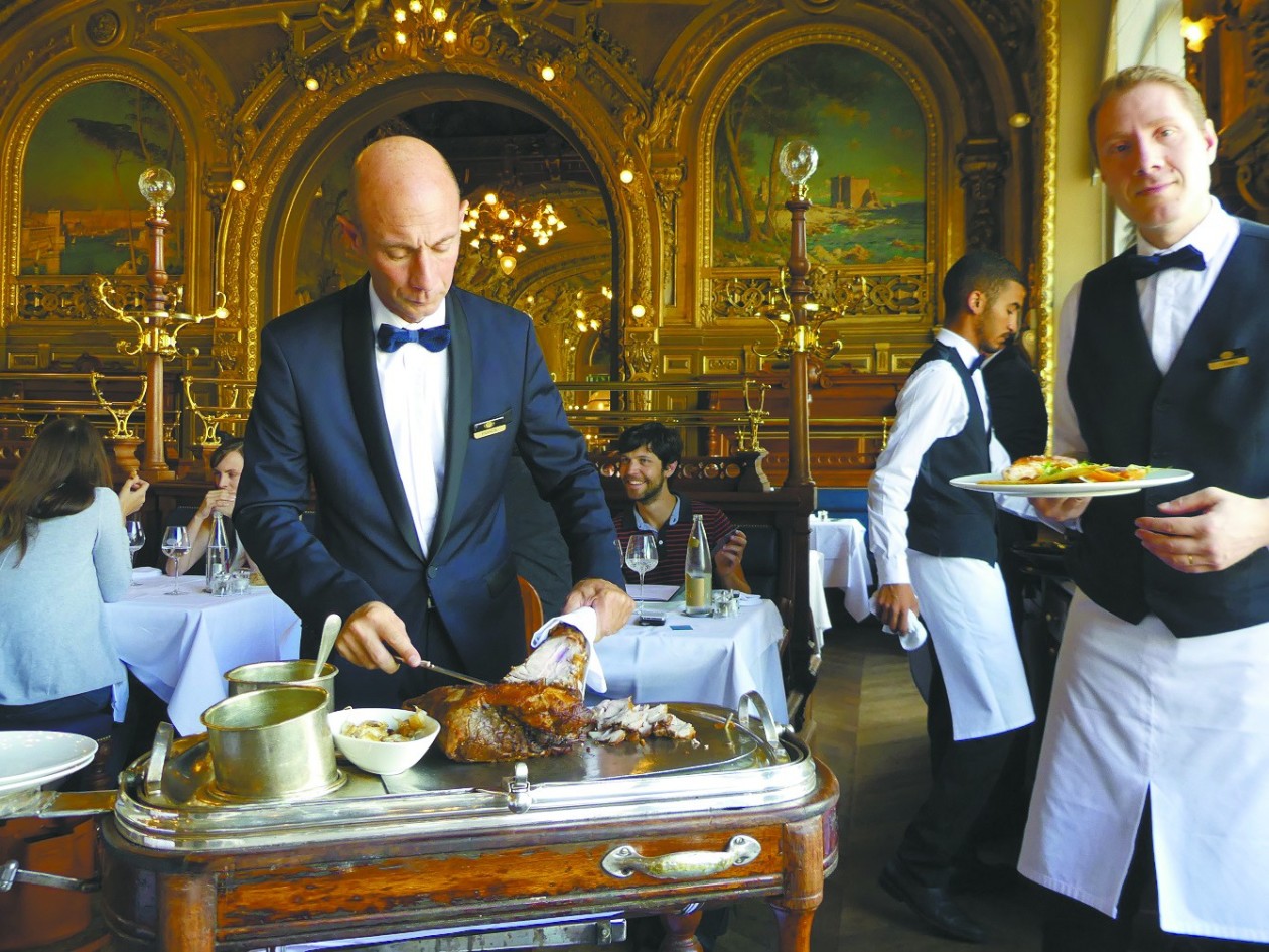 【环球时报驻法国特约记者 潘 亮】“金碧辉煌、宫廷盛宴”,这就是《环球时报》记者第一次走进“蓝色火车”餐厅时脑海中立刻联想到的形容词。乘坐地铁直达巴黎里昂火车站后,从地下通道出来就到了车站站台。回头望,“蓝色火车”餐厅的招牌出现在巨幅列车时刻显示屏的右方,十分醒目。不过,这可不是普通火车站里的快餐店,而是在法国广为传唱的歌曲《夜幕中的蓝色火车》中描绘的传奇美食餐厅。
