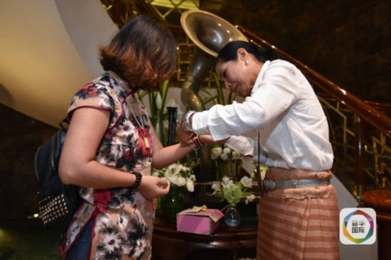 科甘(右)为杨莉佩戴象征泰国国旗三色的手链。(新华社记者李芒茫摄)