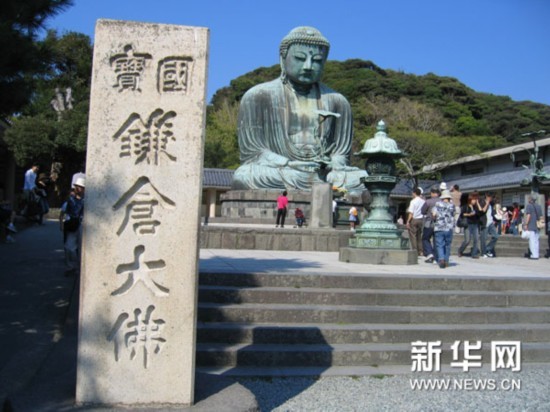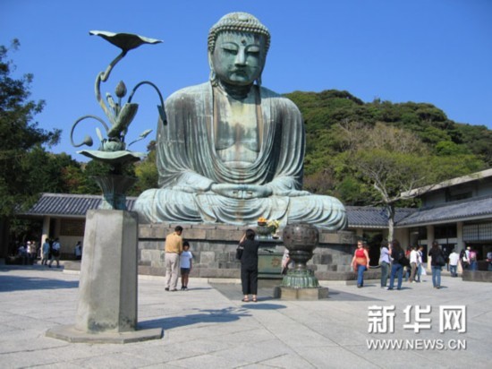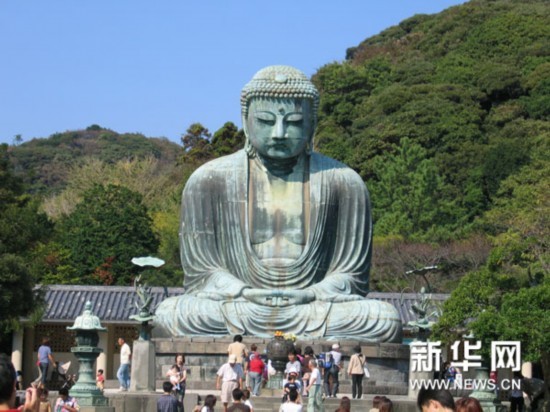 位于古都镰仓的净土宗寺院高德院内的阿弥陀如来青铜坐像俗称镰仓大佛,是古都镰仓的象征,大佛净高11.3米,连台座高13.35米,重约121吨。佛像建造于1252年,大佛的较平的面相、较低的肉髻和前倾的姿势等,具有镰仓时代流行的宋代佛像的风格,是镰仓时期的代表性塑像,被定为日本国宝。与奈良东大寺大佛在后世经历多次补修不同,镰仓大佛基本保持了造像当初的形态,所以非常珍贵。新华社记者 蓝建中摄