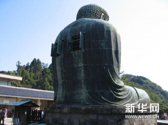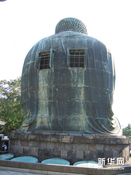 镰仓大佛头部分5次浇铸、身体分7次浇铸,背部分6次浇铸。造像中空,背部开窗,游客可以进入内部参观,内部变色的部分是用强化塑料进行的加固。新华社记者 蓝建中摄