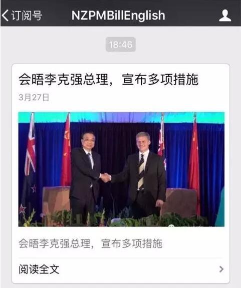 就在李克强总理抵达新西兰前,新西兰总理英格利希在中国的微信上开了一个公众号“NZPMBillEnglish”,并发出了文章:《欢迎李克强总理》。