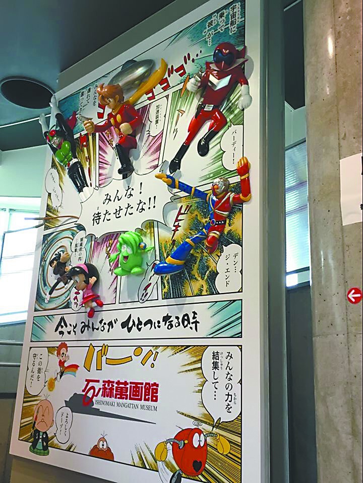 【环球时报驻日本特约记者 孙秀萍】日本的石卷市内有一条蜿蜒的河流叫“旧上北川”,河中岛上有个巨大的飞碟式建筑,远远看去十分抢眼。那就是日本动漫迷的胜地“石之森万画馆”。那里以《假面骑士系列》作品为主,展示了大量动漫作品的原画和模型、书籍等(如图)。