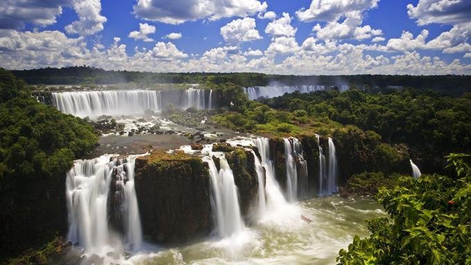 伊瓜苏瀑布不仅比尼亚加拉大瀑布高,而且几乎比之宽两倍,与巴西和阿根廷接壤,在世界人类遗产之列。阿根廷拥有近275个瀑布,其中包括80米高的半圆形“魔鬼咽喉”瀑布。