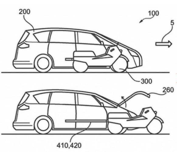 该专利表明,抬升车辆的引擎盖后,可将摩托车拆下,供用户使用。待需要归位时,只需靠“引导元件(guide elements)”就能将摩托车重新放入车内。
