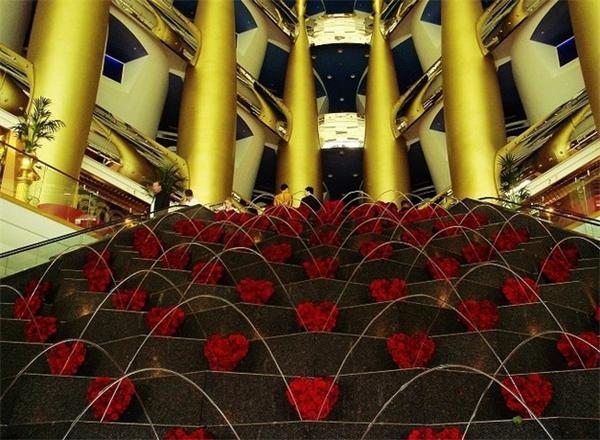 首先进入我们眼帘的是14级黑色大理石台阶,每级台阶上放着由玫瑰组成的心型花环。最奇特的是喷水,不时的变化着花样,如同不断变化的音符一般。据说,帆船酒店的每一种喷水方式都经过精心设计,约15-20分钟就换一种喷法,跟水舞没什么两样。
