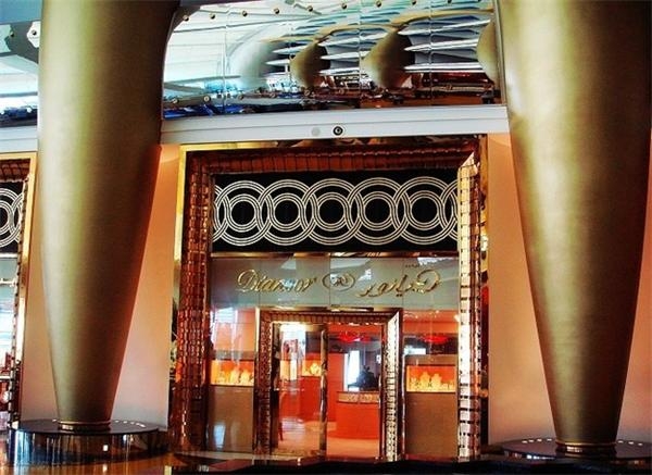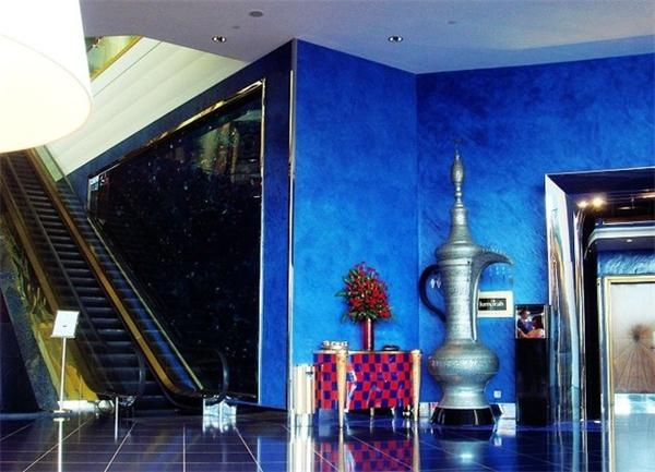 都说帆船酒店都是金子的,在建造时用了22吨纯黄金来美化酒店内部。我不知道是不是金子做的,但是,大部分造型都是金黄色的,到处都金灿灿的,看起来也挺晃眼的。据说,25楼及以上楼层的皇家套房搜罗了世界各地的摆设,家具是镀金的,如同皇宫一样气派,连顶级时装设计师范思哲也对此赞不绝口。