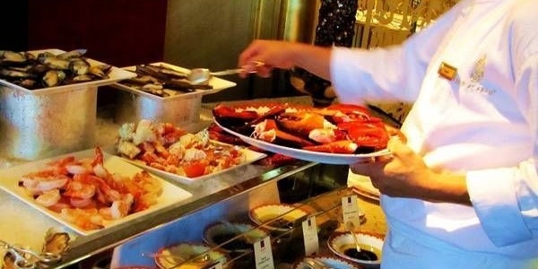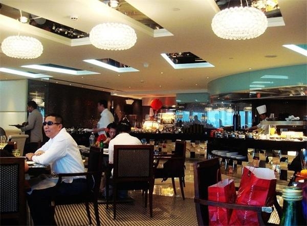 帆船酒店有很多餐厅,我们订的亚洲餐厅,在GM层。进去的时候,迎宾小姐用汉语问我们订的是哪张桌,之后告诉我们先坐着等一会。不到5分钟,小姐告诉我们可以进去了,把我们引导一个靠窗的小桌前,说是自助可以随便取东西,还有日本的料理。
