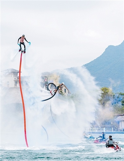 广东省广州市增城区,依托废弃矿湖、温泉等资源打造的森林海旅游度假区内正在进行水上表演。王 剑摄(人民视觉)