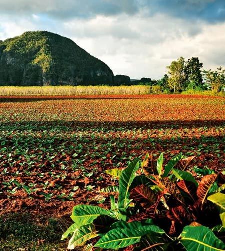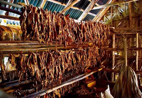 每年2、3月是烟叶收获的季节,而雪茄的品质却在100天前便已注定将有所差别。从育苗开始,不同品种的烟苗种植在不同的地块中。移栽的地垅沟深约20 厘米,垅距为60厘米,移栽苗距为50厘米,移栽期为每年的11月份。在生产期内,用于雪茄外包皮的烟叶需要遮阳生长,如此而得的烟叶可避免叶脉木质化, 使得烟片柔软,梗叶容易分离。雪茄叶的采摘不同于烤烟的采摘,不必等到叶面发泡微黄。当然,也不可过早。一般等到九成熟时,便可摘叶。采摘时一般三、四片 叶为一束,用草皮捆扎,在地边的晾棚中风干。根据当地温度,一般7至10天即可收架贮存。古巴的海洋性气候使得空气中带有盐分,湿度较大,烟叶不容易破 碎。