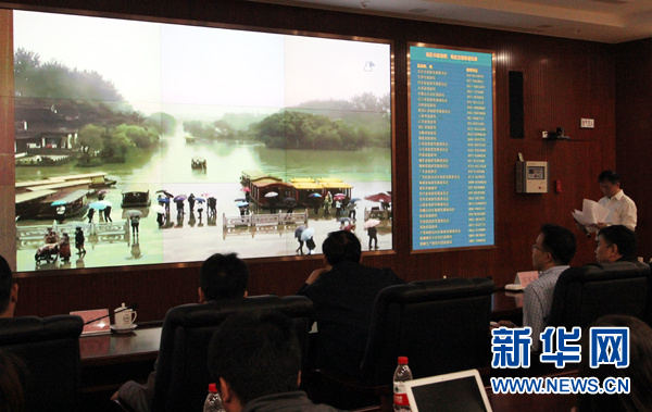 10月1日,国家旅游局十一假日旅游工作新闻发布会上,国家旅游局规财司相关负责人连线扬州瘦西湖景区。 新华网 郭香玉摄